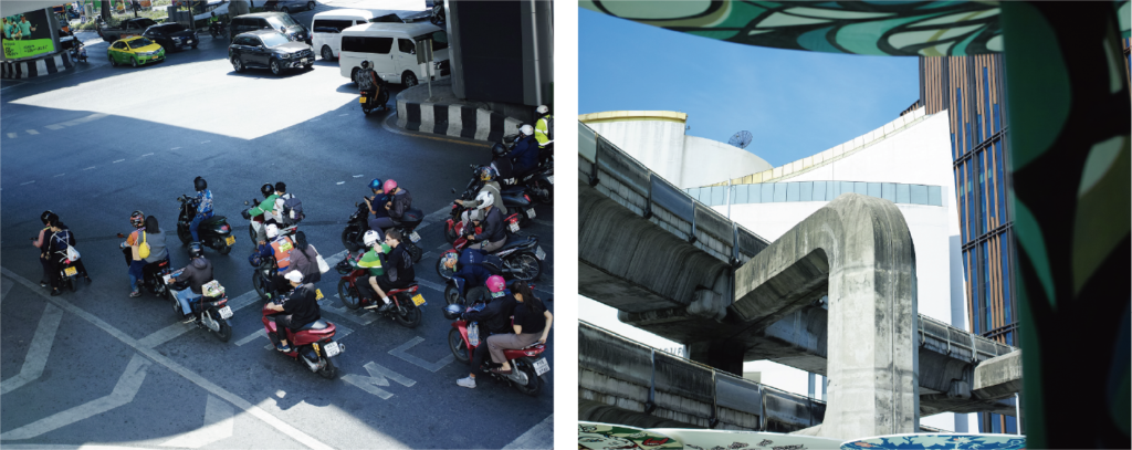 朝9:30。この日もホテルからラーマ1世通りを歩いてサイアム・パラゴンへ。現地の出勤時間と重なるのか、それとも常時渋滞エリアなのか、とにかくすごい交通量。どこを向いても眼前には車とバイクと屋台、頭上には巨大建築の間をコンクリートの高架鉄道と支柱がクネクネ。